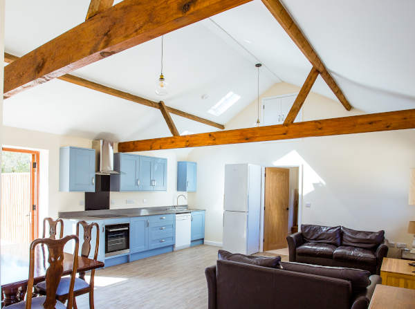 Inside the front door which is a replica of the original stable door opens up to a large open plan living area. The kitchen, dining area and living room are open-plan with double doors leading to the patio area. A double bedroom with an en suite is located past the kitchen. At the other end of the property is a twin room with beds that can be combined to created a Super King Bed.
